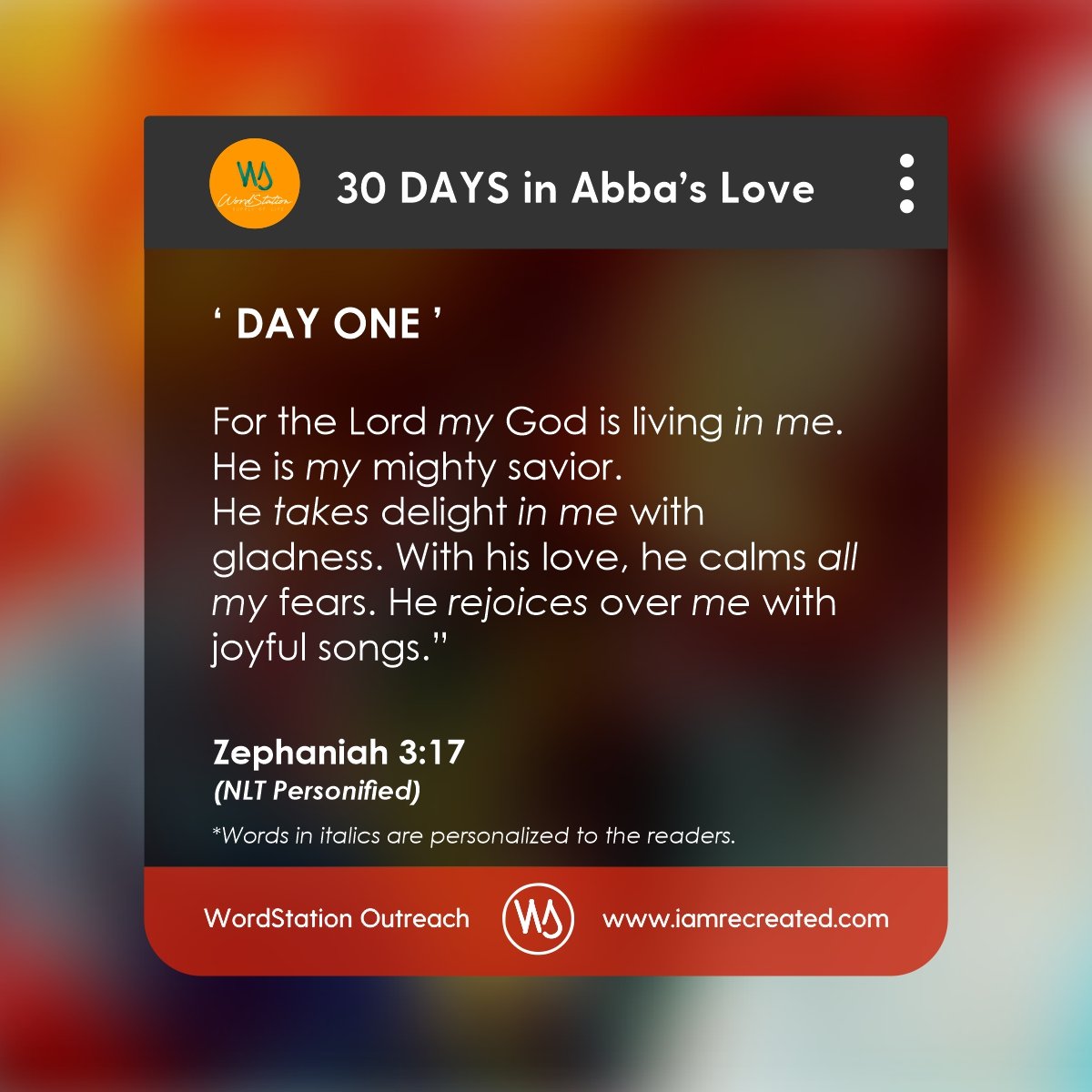 Experience a shift in your life - 30 days in Abba's Love expressed through simple graphics with words of eternal life personalized for you. Feel free to download, and share within your social networks. Stay Loved; Stay Blessed!