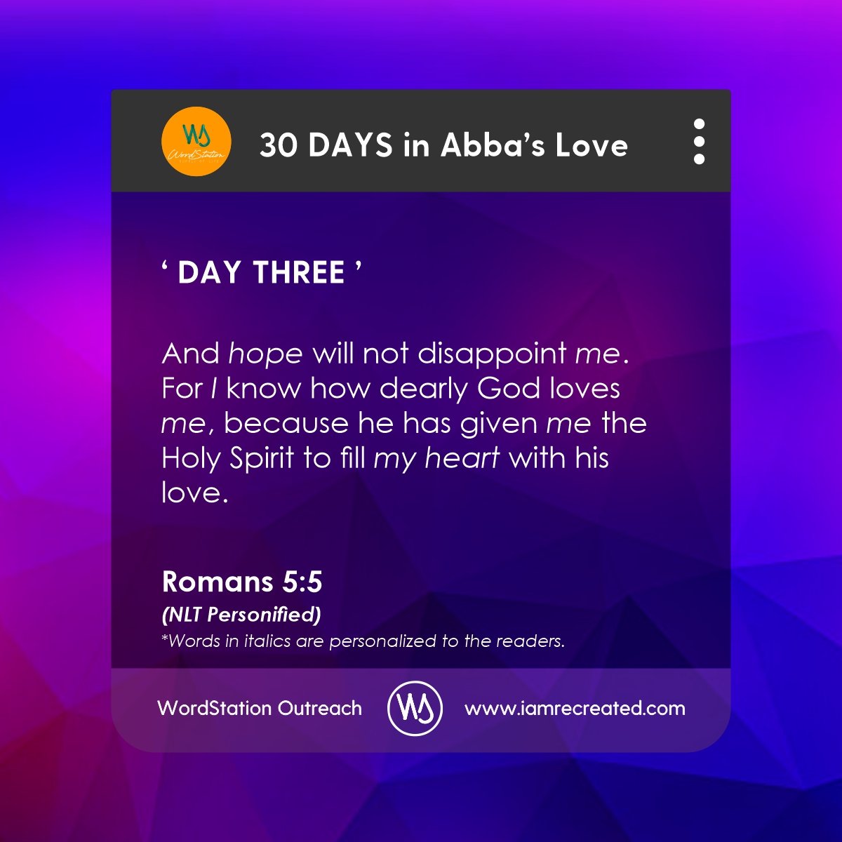 Experience a shift in your life - 30 days in Abba's Love expressed through simple graphics with words of eternal life personalized for you. Feel free to download, and share within your social networks. Stay Loved; Stay Blessed!
