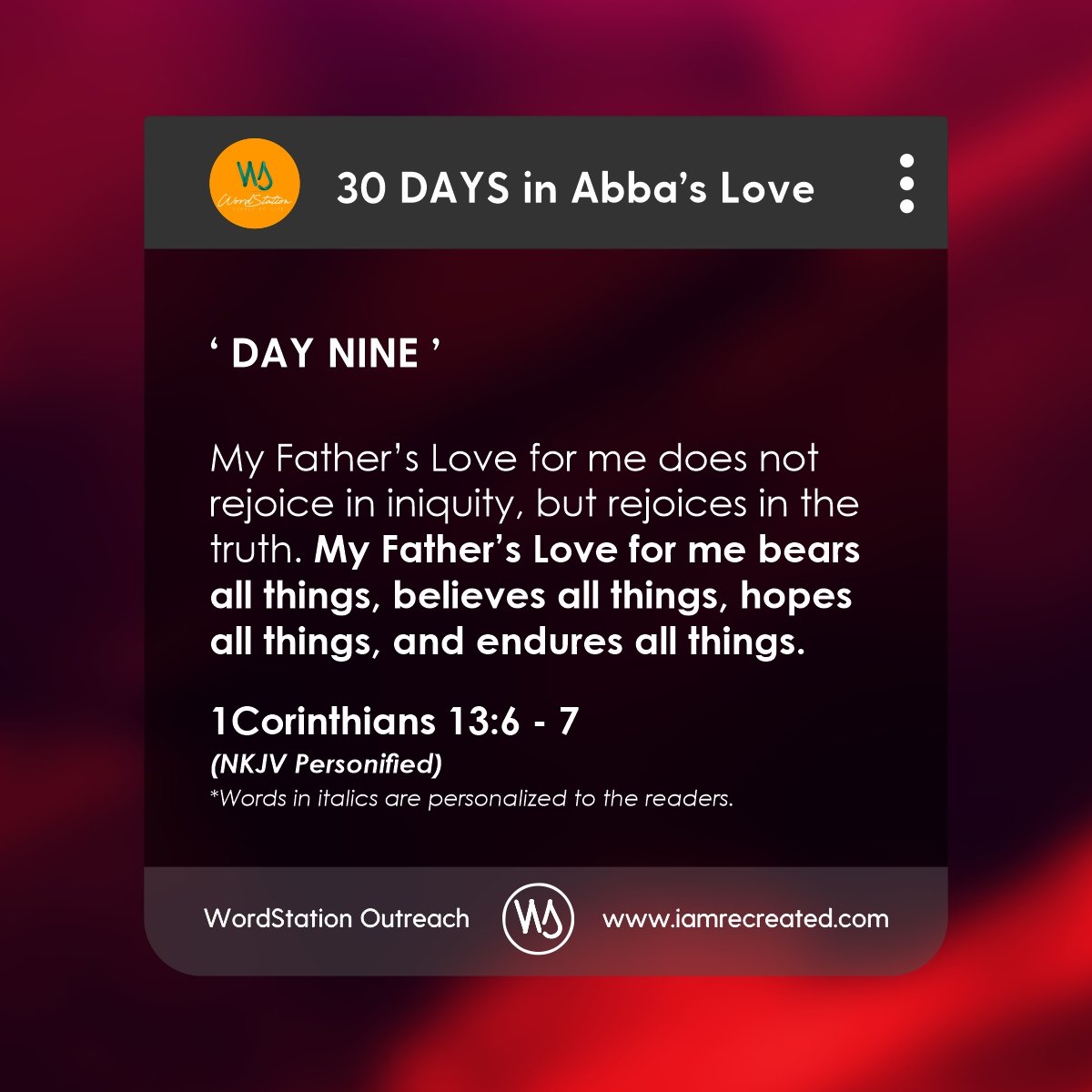 Experience a shift in your life - 30 days in Abba's Love expressed through simple graphics with words of eternal life personalized for you. Feel free to download, and share within your social networks. Stay Loved; Stay Blessed!