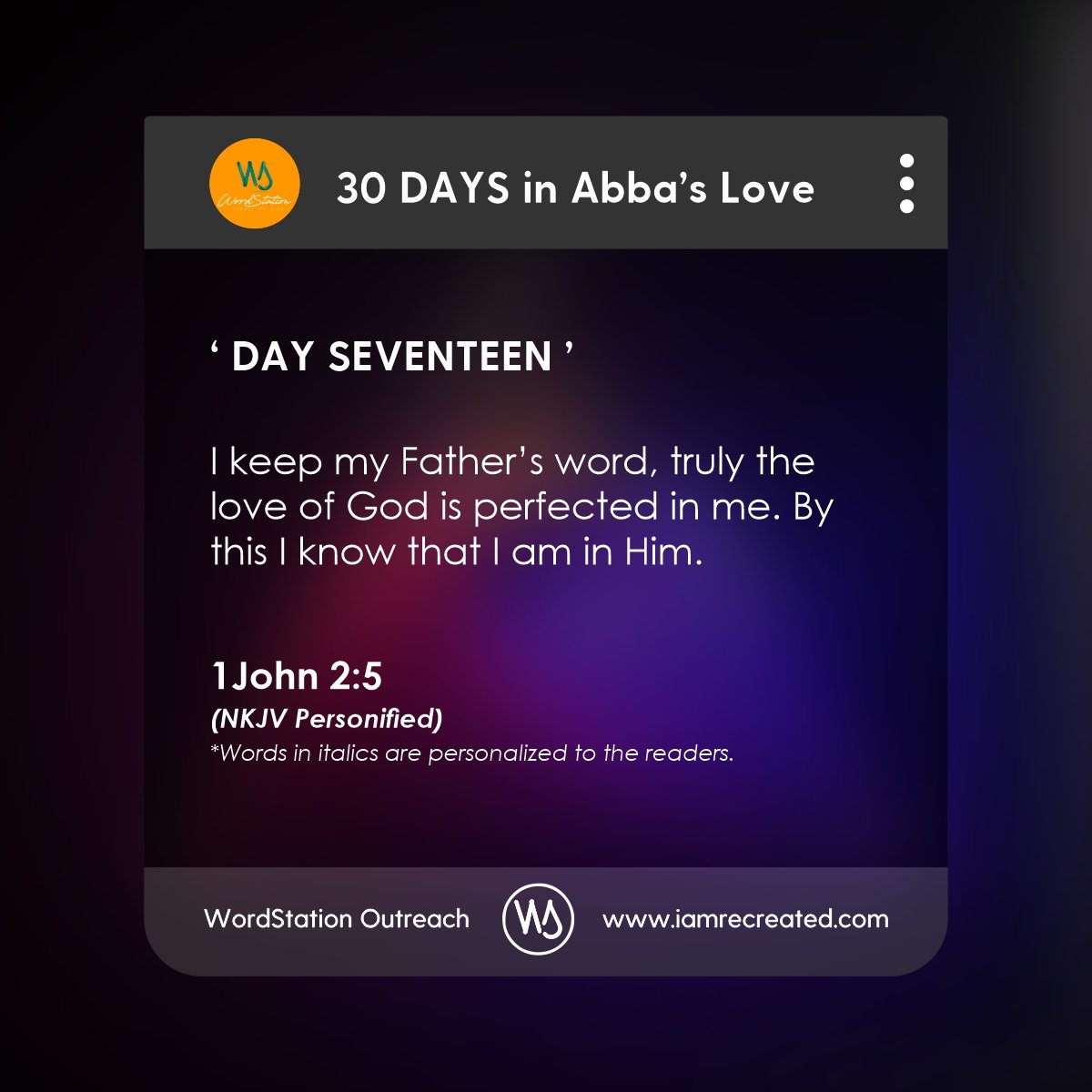Experience a shift in your life - 30 days in Abba's Love expressed through simple graphics with words of eternal life personalized for you. Feel free to download, and share within your social networks. Stay Loved; Stay Blessed!