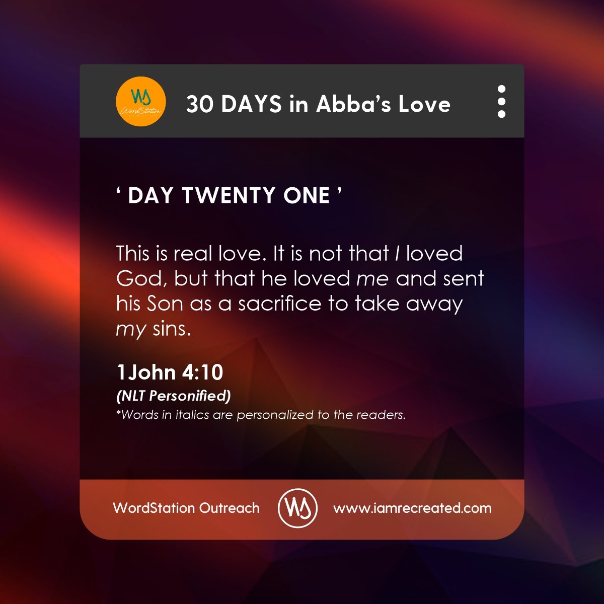 Experience a shift in your life - 30 days in Abba's Love expressed through simple graphics with words of eternal life personalized for you. Feel free to download, and share within your social networks. Stay Loved; Stay Blessed!